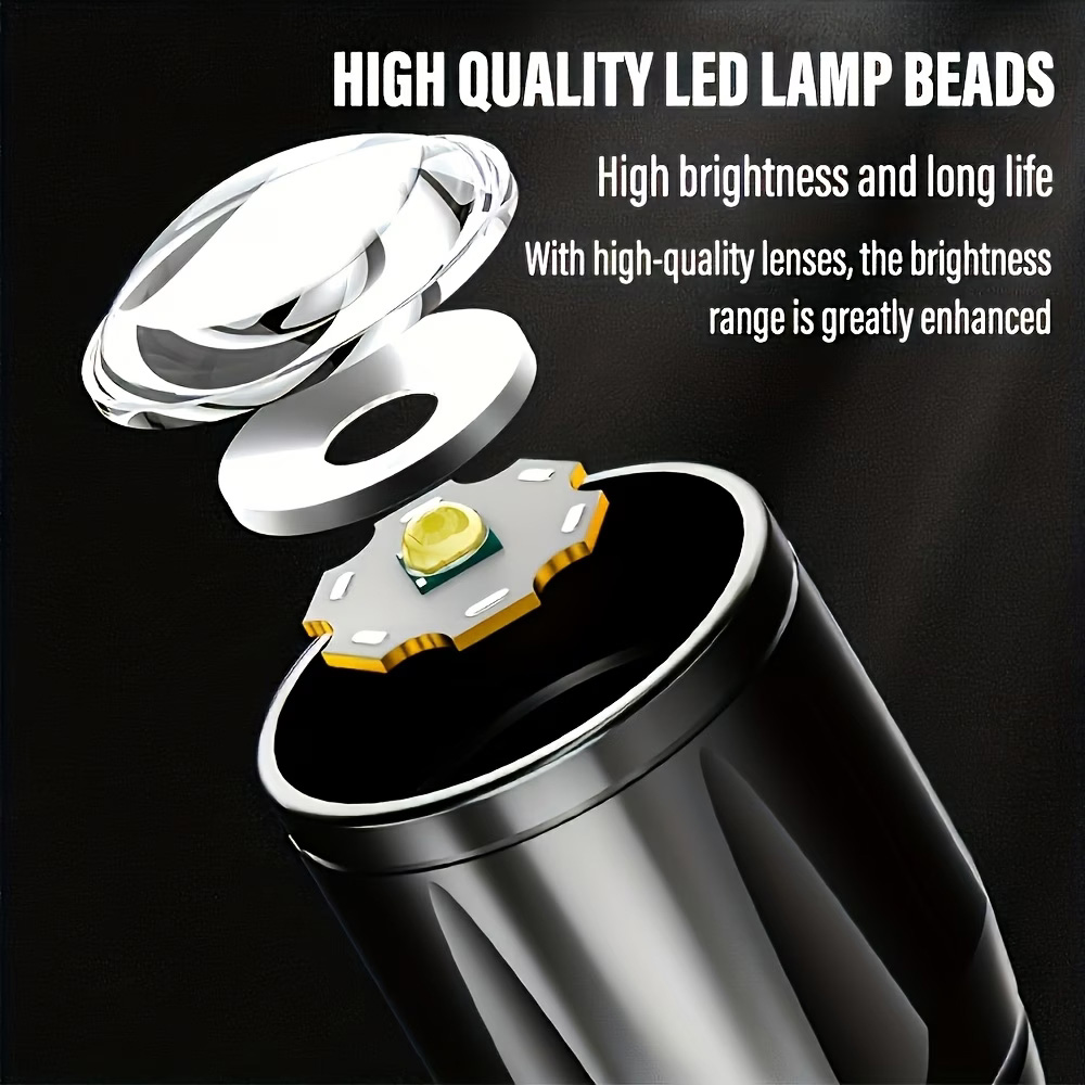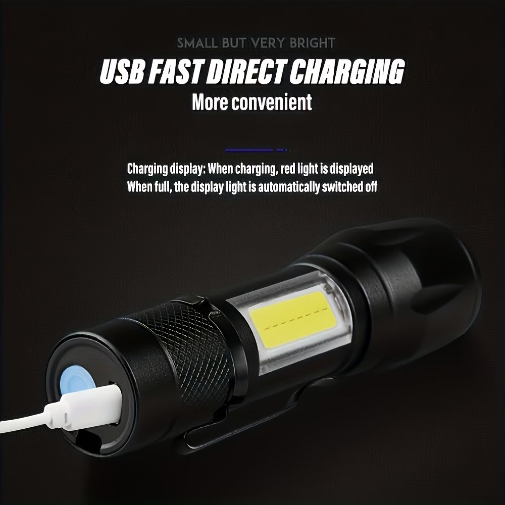 De zaklamp is uitgerust met een COB floodlight, wat zorgt voor een hoge helderheid en een brede lichtspreiding. Perfect om grote oppervlakken gelijkmatig te verlichten, zoals een werkplek, tent of ruimte.